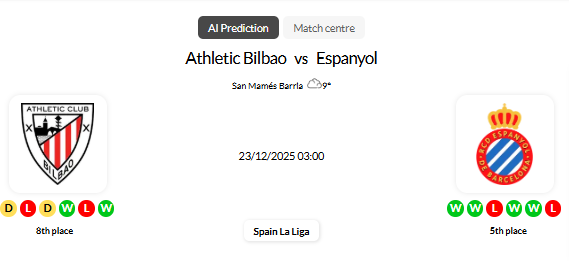 Athletic Club host RCD Espanyol at San Mamés on Monday night in a fixture that defies historical expectations. Espanyol sit fifth on 30 points and chase a fifth consecutive league victory, while Athletic occupy seventh with 23 points and must arrest a stuttering run that has seen them fall behind the season’s surprise package.