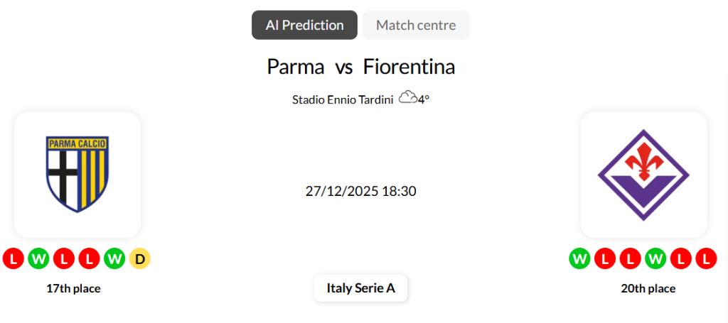 Fiorentina arrive with momentum and firepower. Moise Kean has scored in four consecutive Serie A matches, spearheading a team that recently dismantled Udinese 5-1. Parma, meanwhile, have dropped the most points from winning positions in the division this season (12), a statistic that encapsulates their struggle to close out games.